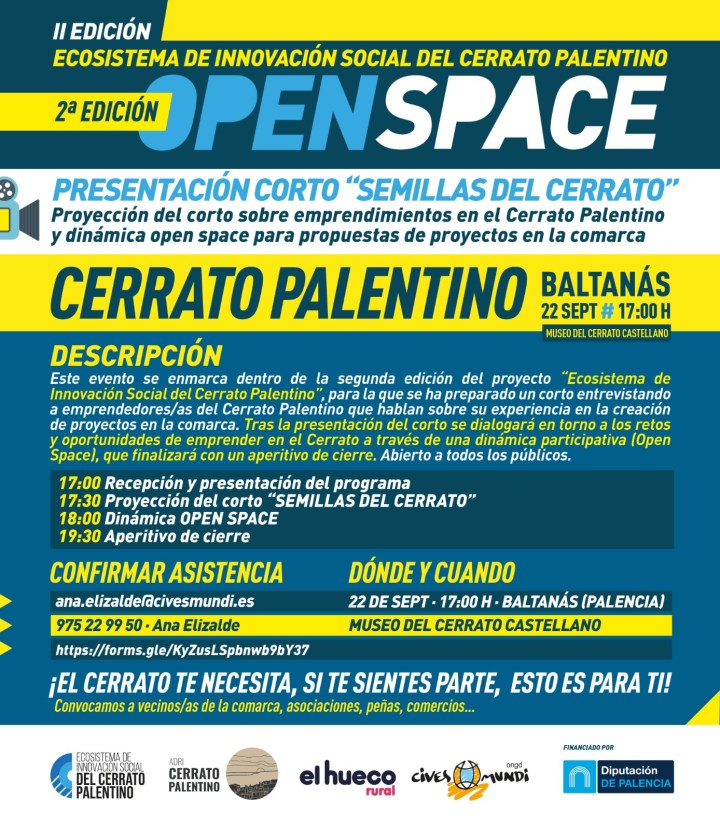 El proyecto del Ecosistema de Innovación Social del Cerrato Palentino, encara una segunda edición a la que se dará el pistoletazo de salida este viernes, 22 de septiembre, con la celebración de un ‘Open Space’ en el que se proyectará el documental ‘Semillas del Cerrato’, realizado por la empresa Visual Creative para la ocasión, sobre los antiguos y actuales oficios en la comarca, y que servirá de inspiración antes de comenzar a idear y trabajar.